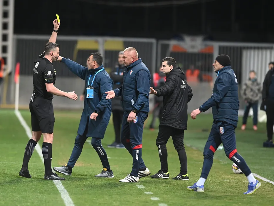 Arbitrul central Andrei Moroita acorda un cartonas galben lui Cristinel Termure sub privirile lui Toni Petrea si arbitrului de rezerva Bogdan Dumitrache in meciul de fotbal dintre Chindia Targoviste si FC Voluntari, contand pentru Superliga Superbet, desfasurat pe Stadionul Ilie Oana din Ploiesti, luni 13 martie 2023. © FOTO:Razvan Pasarica/SPORT PICTURES