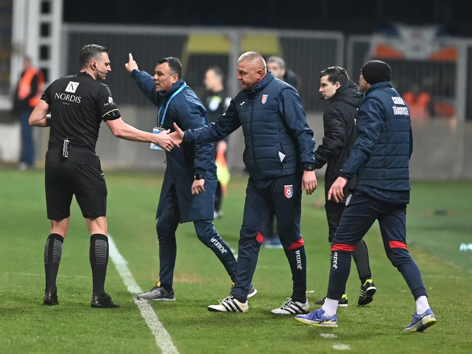 Cristinel Termure isi recunoaste greseala si il saluta pe arbitrul central Andrei Moroita sub privirile lui Toni Petrea si arbitrului de rezerva Bogdan Dumitrache in meciul de fotbal dintre Chindia Targoviste si FC Voluntari, contand pentru Superliga Superbet, desfasurat pe Stadionul Ilie Oana din Ploiesti, luni 13 martie 2023. © FOTO:Razvan Pasarica/SPORT PICTURES