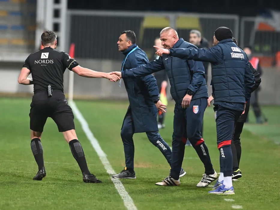 Cristinel Termure isi recunoaste greseala si il saluta pe arbitrul central Andrei Moroita sub privirile lui Toni Petrea in meciul de fotbal dintre Chindia Targoviste si FC Voluntari, contand pentru Superliga Superbet, desfasurat pe Stadionul Ilie Oana din Ploiesti, luni 13 martie 2023. © FOTO:Razvan Pasarica/SPORT PICTURES