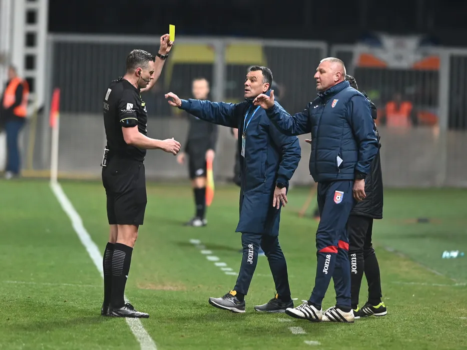 Arbitrul central Andrei Moroita acorda un cartonas galben lui Cristinel Termure sub privirile lui Toni Petrea in meciul de fotbal dintre Chindia Targoviste si FC Voluntari, contand pentru Superliga Superbet, desfasurat pe Stadionul Ilie Oana din Ploiesti, luni 13 martie 2023. © FOTO:Razvan Pasarica/SPORT PICTURES