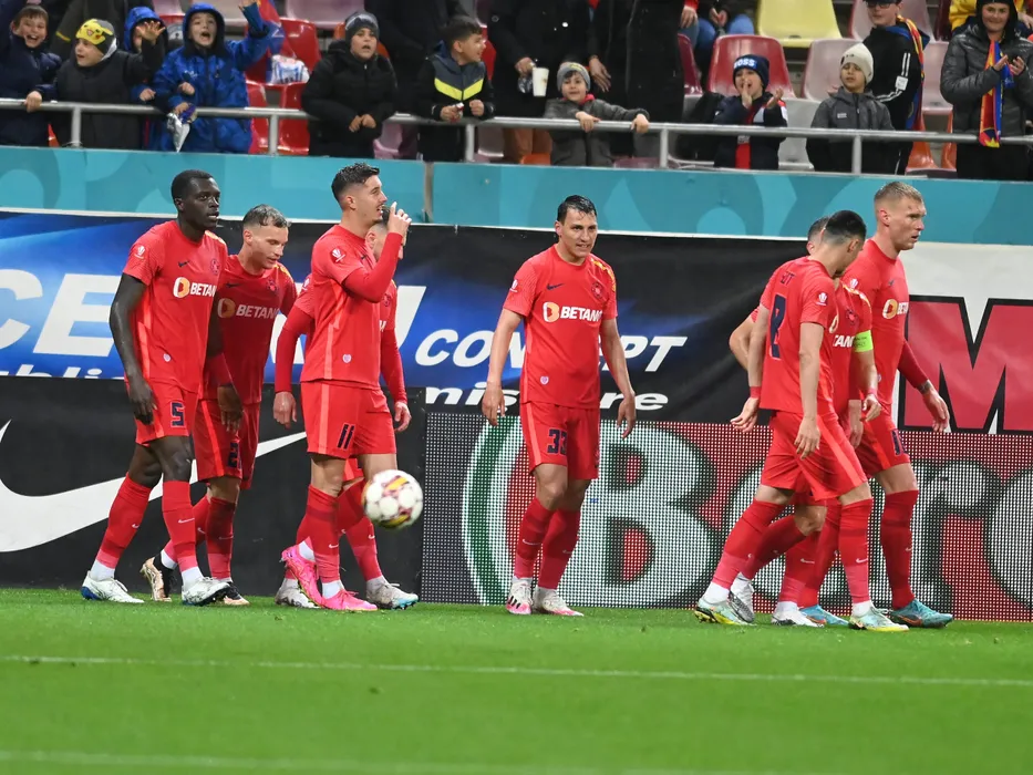 David Raul Miculescu se bucura dupa un gol marcat alaturi de fotbalistii stelisti Grigoras Alexandru Pantea, Joyskim Aurelien Dawa Tchakonte, Deian Cristian Sorescu, Risto Radunovic, Joonas Tamm, Adrian Gheorghe Sut si Darius Dumitru Olaru in meciul de fotbal dintre FCSB si Sepsi OSK Sfantu Gheorghe, contand pentru Play-off-ul Superligii Superbet, desfasurat pe Arena Nationala din Bucuresti, luni 8 mai 2023. © FOTO:Razvan Pasarica/SPORT PICTURES