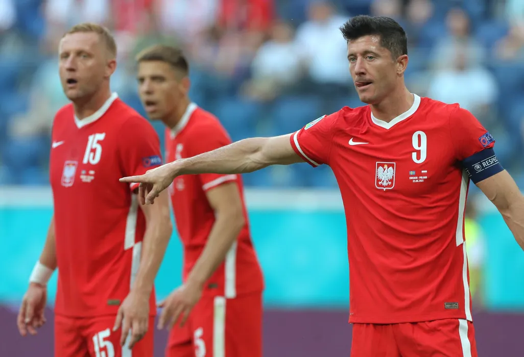 23 June 2021, Russia, St. Petersburg: Poland's Robert Lewandowski (R) gives instructions to his teammates during the UEFA EURO 2020 Group E soccer match between Sweden and Poland at St. Petersburg Stadium. Photo: Igor Russak/dpa