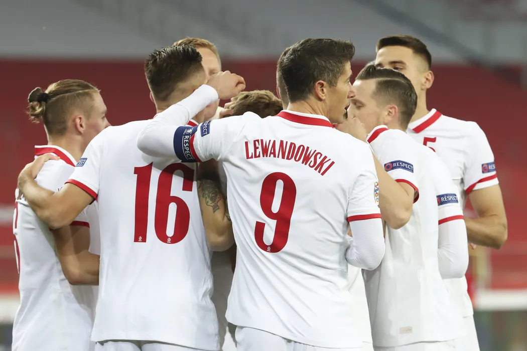 Poland players celebrate scoring their side's first goal during the Nations League soccer match between Poland and The Netherlands at Silesian Stadium in Chorzow, Poland, Wednesday, Nov. 18, 2020. (AP Photo/Czarek Sokolowski)