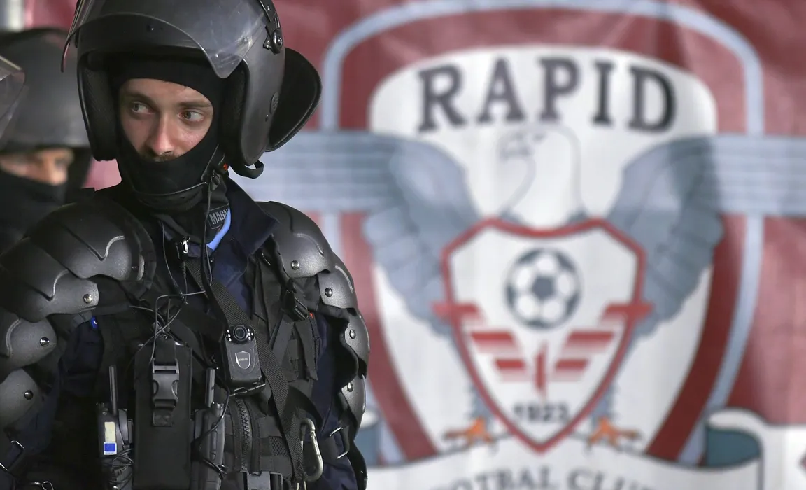 Jandarm langa sigla Rapidului la meciul de fotbal dintre Rapid Bucuresti si Sepsi OSK Sfantu Gheorghe, contand pentru Play out-ul Ligii 1 Casa Pariurilor, desfasurat pe Stadionul Rapid-Giulesti din Bucuresti, sambata 23 aprilie 2022. © FOTO:Razvan Pasarica/SPORT PICTURES