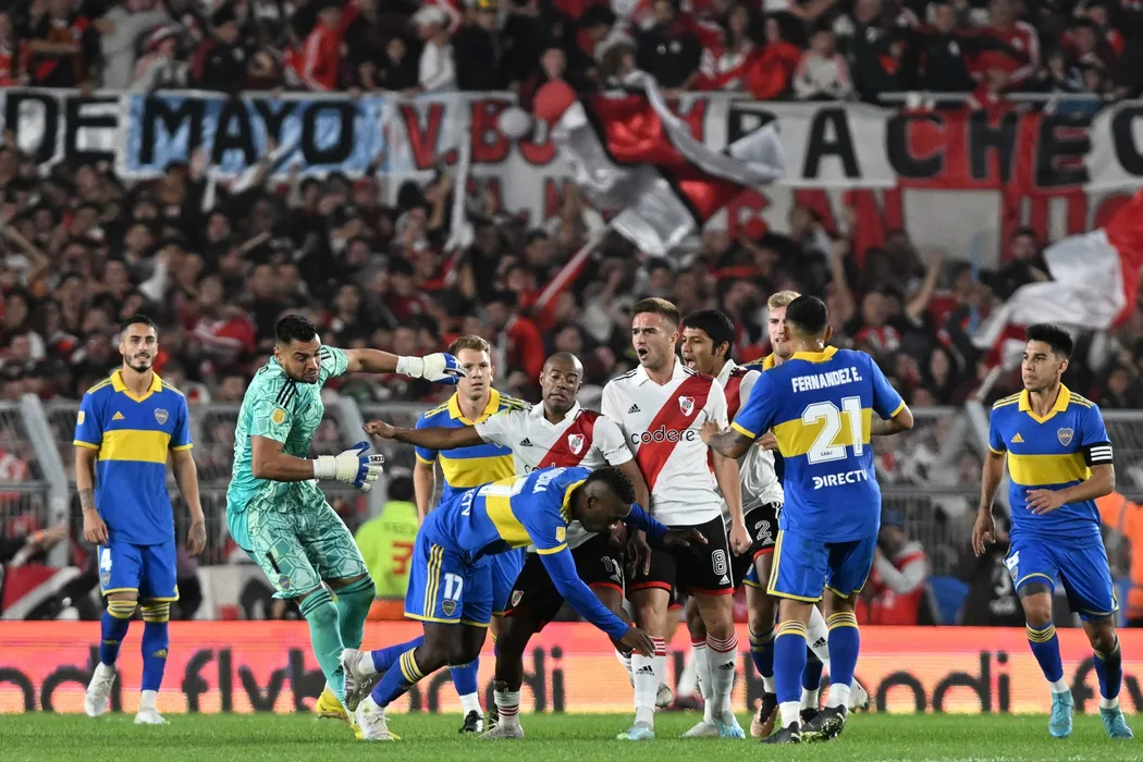 Monumental de Nunez Stadium River Plate players fight with Boca Juniors players, during the match between River Plate and Boca Juniors, for the 15th round of the 2023 Argentine Championship, at the Monumental de Nunez Stadium this Sunday, 07. 30761 (Luciano Bisbal / SPP),Image: 774506905, License: Rights-managed, Restrictions: World Rights Except Brazil and Mexico * BRAOUT MEXOUT, Model Release: no