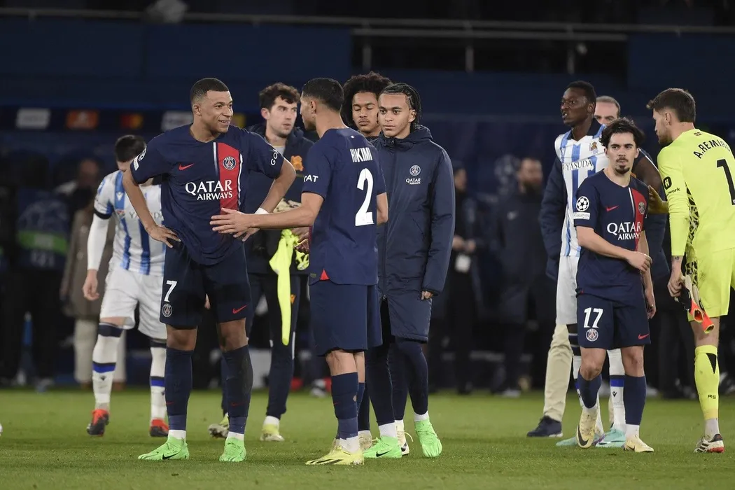 Kylian Mbappe (PSG) with Achraf Hakimi (PSG) and his brother Ethan Mbappe (PSG) at the end of Champions League football match, round of 16 first leg, between Paris Saint-Germain and Real Sociedad at Parc des Princes in Paris, France, on February 14, 2024. Photo Jean-Marie Hervio / KMSP,Image: 846741776, License: Rights-managed, Restrictions: , Model Release: no
