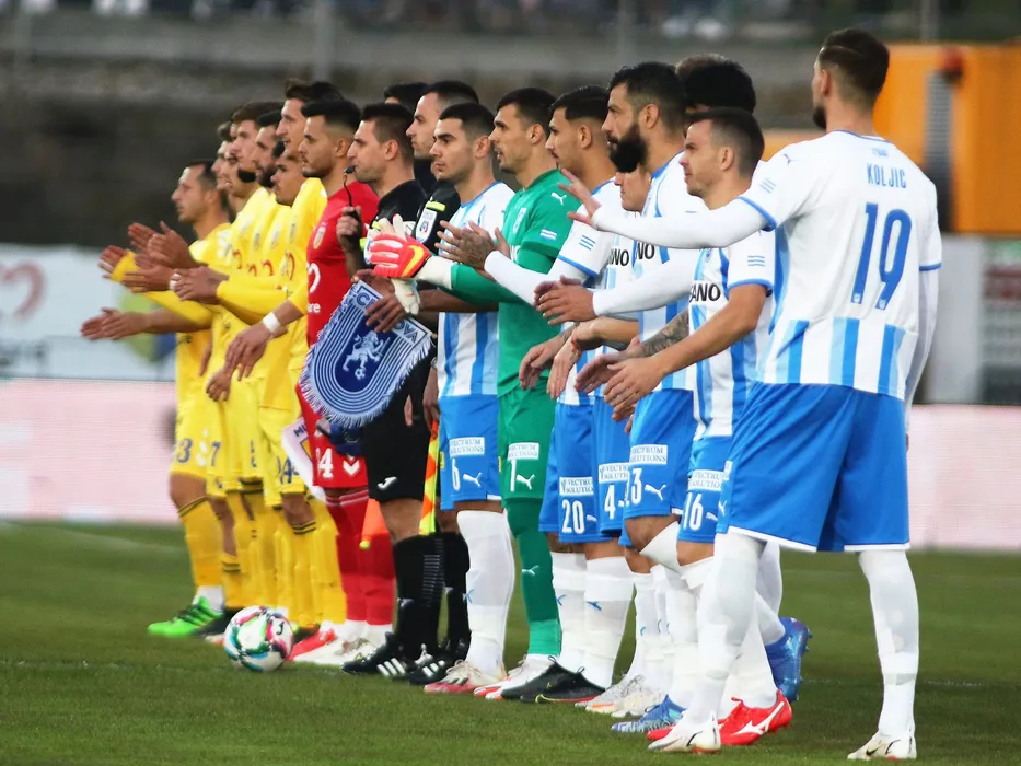 Jucatorii celor doua echipe inainte de inceperea meciului de fotbal dintre CS Minaur Baia Mare si Universitatea Craiova din cadrul optimilor de finala ale Cupei Romaniei, disputat pe Stadionul Viorel Mateianu din Baia Mare, miercuri 27 octombrie 2021. FOTO: Paul Ursachi / Sportpictures