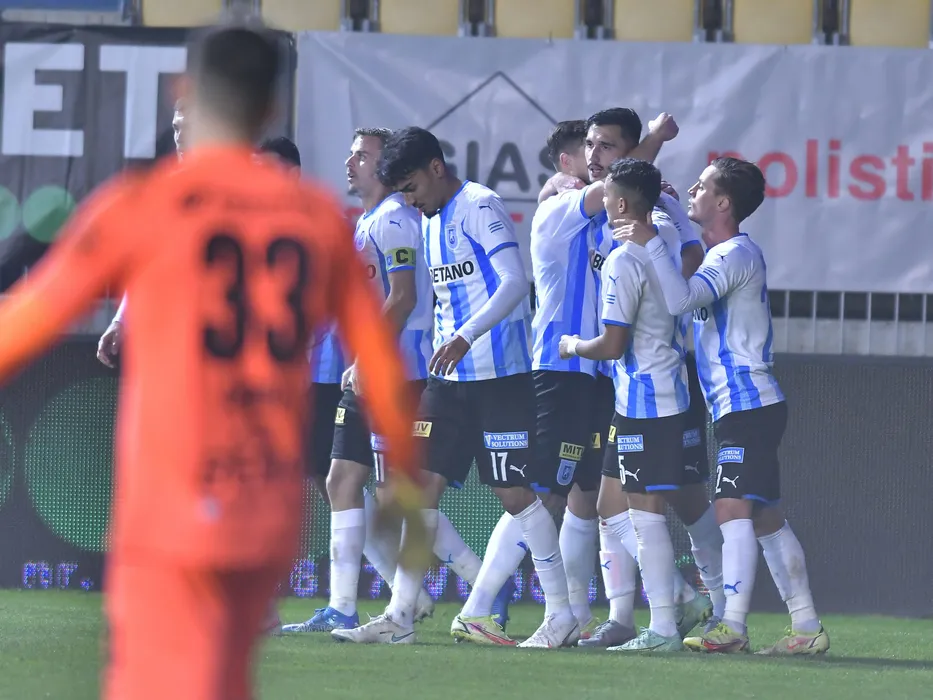 Bucurie a fotbalistilor craioveni dupa un gol marcat cu Nicusor Silviu Bancu, Stefan Baiaram, Andrei Virgil Ivan si Gustavo Vagenin in meciul de fotbal dintre Chindia Targoviste si Universitatea Craiova, contand pentru Liga 1 Casa Pariurilor, desfasurat pe Stadionul Ilie Oana din Ploiesti, vineri 22 octombrie 2021. © FOTO:Razvan Pasarica/SPORT PICTURES