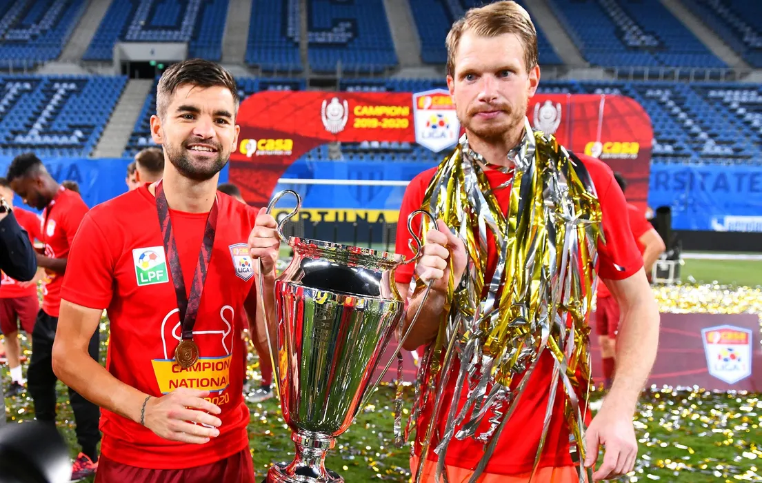 Mateo Susic si Giedrius Arlauskis pozeaza alaturi de trofeu dupa castigarea titlului de campioana in urma meciului de fotbal dintre Universitatea Craiova si CFR Cluj, contand pentru play-off-ul Ligii 1 Casa Pariurilor, disputat fara spectatori pe Stadionul Ion Oblemenco din Craiova, luni 3 august 2020. © FOTO:Razvan Pasarica/SPORT PICTURES