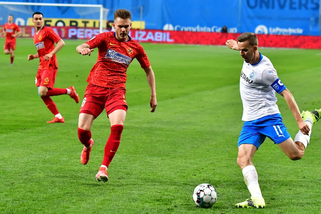 Denis Gratian Harut (S) si Nicusor Bancu (D) in meciul de fotbal dintre echipele U Craiova - FCS Bucuresti disputat pe stadionul Ion Oblemenco din Craiova joi 29 aprilie 2021 . REMUS BADEA / MEDIAFAX FOTO