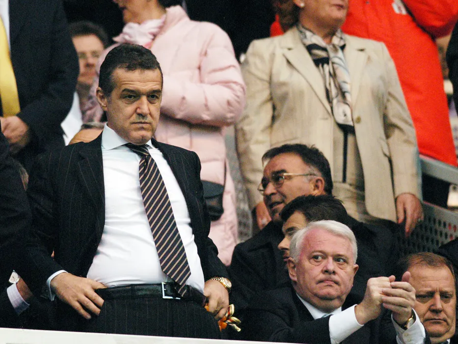 Gigi Becali, Viorel Hrebenciuc si Virgil Becali in tribuna la meciul de fotbal dintre Middlesbrough FC si Steaua Bucuresti, contand pentru semifinala retur a Cupei UEFA, desfasurat pe Stadionul Riverside din Middlesbrough, joi 27 aprilie 2006. © FOTO:Razvan Pasarica/SPORT PICTURES