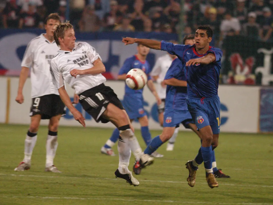 Jan Gunnar Solli si Banel Nicolita in meciul de fotbal dintre Steaua Bucuresti si Rosenborg Trondheim, contand pentru Cupa UEFA, disputat pe Stadionul Ghencea-Steaua din Bucuresti, miercuri 10 august 2005. © FOTO:Razvan Pasarica/SPORT PICTURES