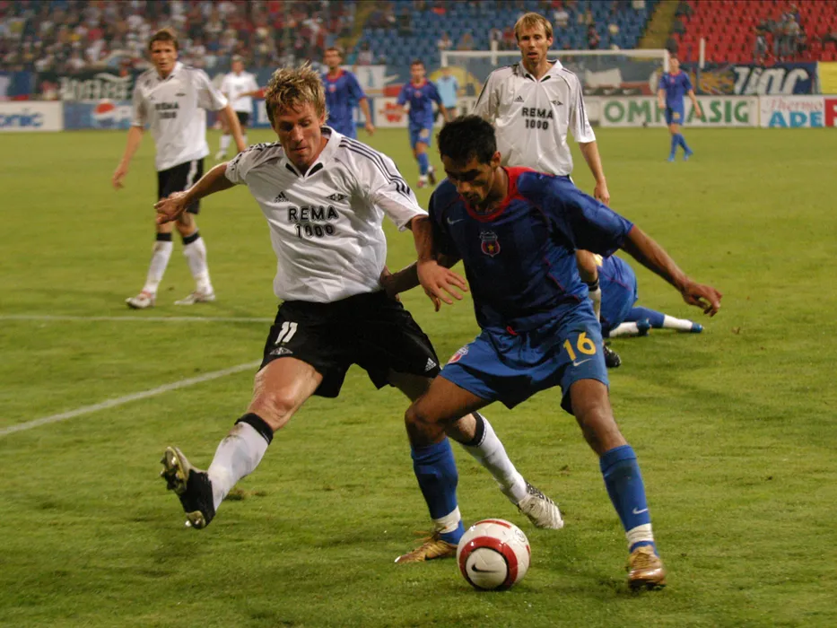 Jan Gunnar Solli si Banel Nicolita in meciul de fotbal dintre Steaua Bucuresti si Rosenborg Trondheim, contand pentru Cupa UEFA, disputat pe Stadionul Ghencea-Steaua din Bucuresti, miercuri 10 august 2005. © FOTO:Razvan Pasarica/SPORT PICTURES
