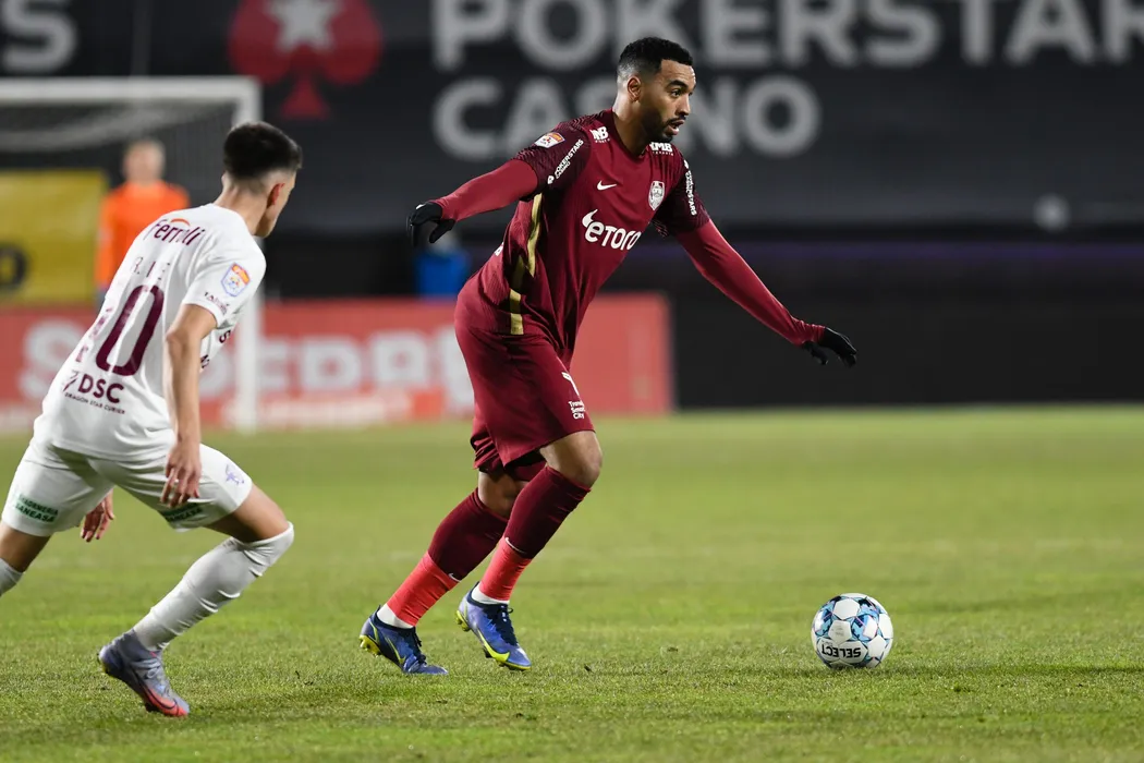 Billel Omrani (D), de la CFR Cluj, suteaza in timpul meciului de fotbal contra echipei Rapid din etapa a XXVII - a a Ligii 1, disputat pe stadionul Dr. Constantin Radulescu, duminica, 20 februarie 2022. FLAVIU BUBOI / MEDIAFAX FOTO
