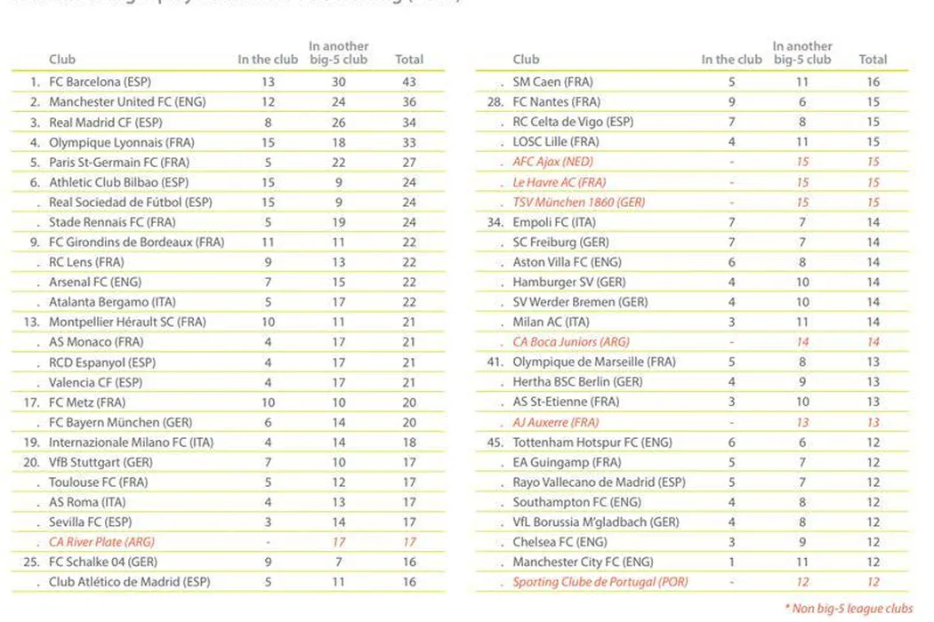 Barcelona are cel mai bun centru de juniori din lume. Catalanii au format cei mai mulți jucători acum activi în primele cinci ligi ale Europei. Manchester United e pe doi, iar Real pe trei