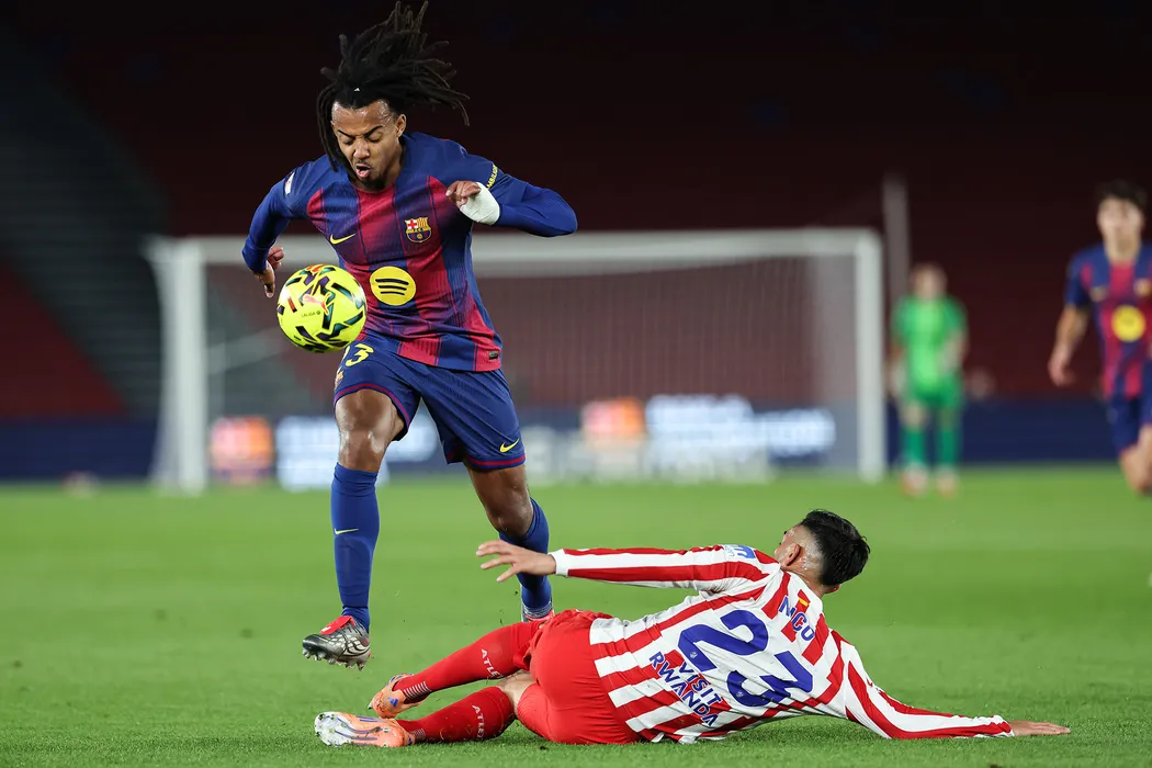 December 2, 2025, Barcelona, Barcelona, SPAIN: Jules Kounde of FC Barcelona and Nico Gonzalez of Atletico de Madrid in action during the Spanish league, La Liga EA Sports, football match played between FC Barcelona and Atletico de Madrid at Spotify Camp Nou stadium on December 2, 2025 in Barcelona, Spain. (Credit Image: © Irina R. Hipolito/AFP7 via ZUMA Press Wire)