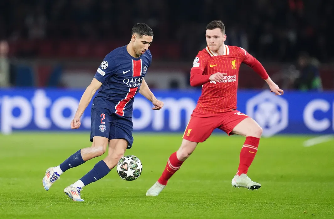 05 March 2025, France, Paris: Paris Saint-Germain's Achraf Hakimi (L) and Liverpool's Andrew Robertson battle for the ball during the UEFA Champions League round of 16 first-leg soccer match between Paris Saint-Germain and Liverpool at Parc des Princes. Photo: Adam Davy/PA Wire/dpa
