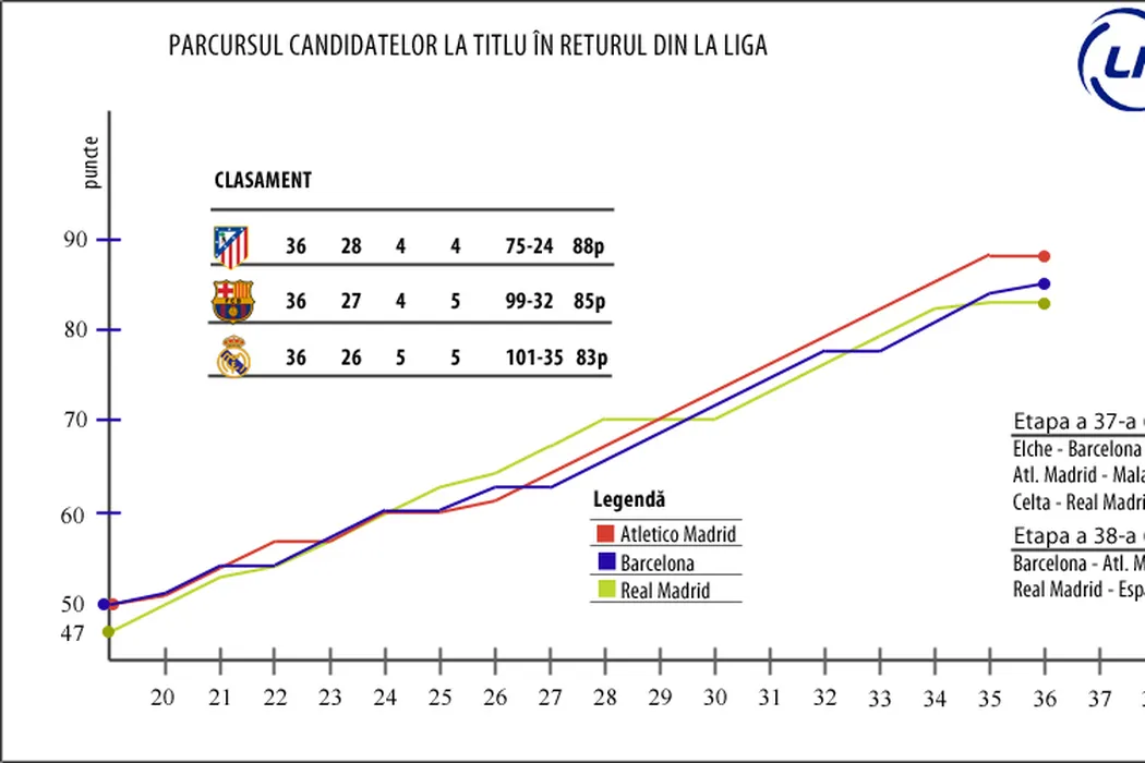 Barcelona – Atletico, o finală pentru titlu. Două etape, trei echipe, patru puncte: situație nemaivăzută în lupta pentru titlu din Primera Division