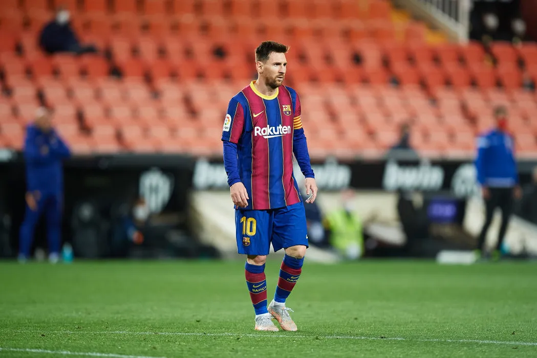 VALENCIA, SPAIN - MAY 02: Lionel Messi of FC Barcelona in action during the La Liga Santander match between Valencia CF and FC Barcelona at Estadio Mestalla on May 02, 2021 in Valencia, Spain. Sporting stadiums around Spain remain under strict restrictions due to the Coronavirus Pandemic as Government social distancing laws prohibit fans inside venues resulting in games being played behind closed doors. (Photo by Aitor Alcalde Colomer/Getty Images)