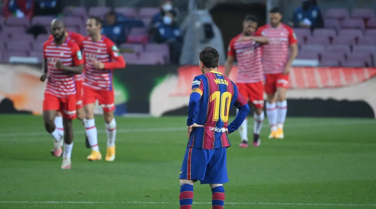 Barcelona's Argentinian forward Lionel Messi reacts after Granada's Spanish forward Jorge Molina scored during the Spanish League football match between Barcelona and Granada at the Camp Nou stadium in Barcelona on April 29, 2021.,Image: 608614100, License: Rights-managed, Restrictions: , Model Release: no, Credit line: Profimedia