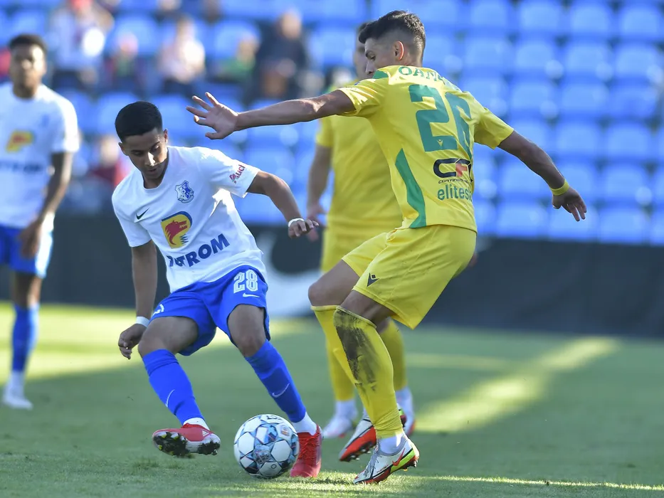 Enes Sali si Gabriel Dorinel Oancea in meciul de fotbal dintre Farul Constanta si CS Mioveni, contand pentru Liga 1 Casa Pariurilor, desfasurat pe Stadionul central al Academiei Gheorghe Hagi din Ovidiu, duminica 26 septembrie 2021. © FOTO:Razvan Pasarica/SPORT PICTURES