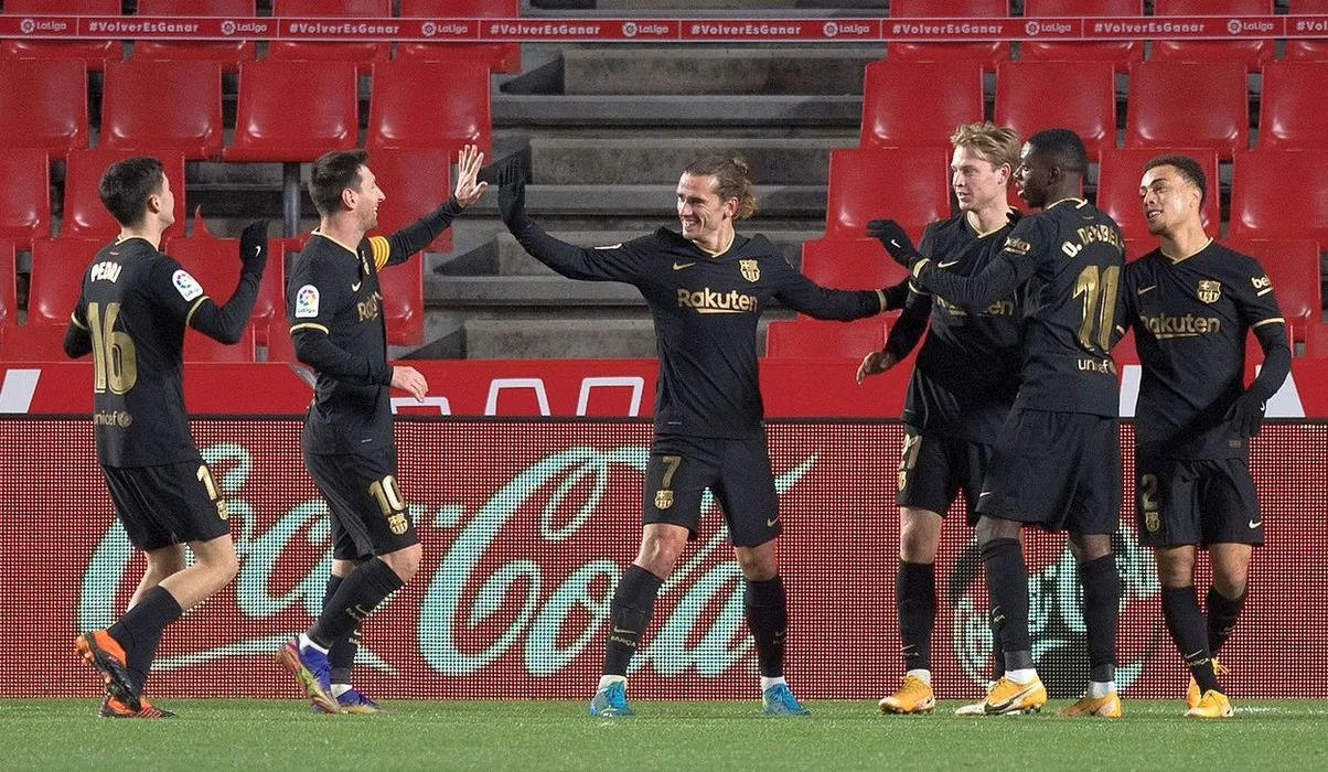 Barcelona's French midfielder Antoine Griezmann (C) celebrates with teammates after scoring a goal during the Spanish League football match between Granada and Barcelona at the Los Carmenes stadium in Granada on January 9, 2021.,Image: 582166258, License: Rights-managed, Restrictions: , Model Release: no