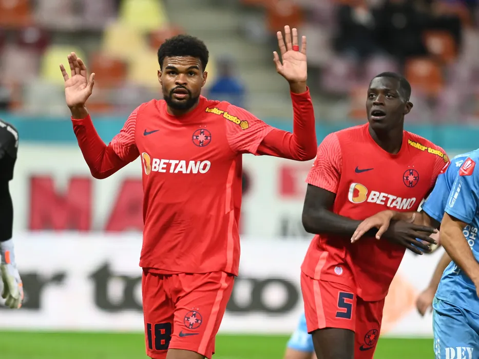 Sylas Laouari Edjouma Malcom si Joyskim Aurelien Dawa Tchakonte in meciul de fotbal dintre FCSB si UTA Arad, contand pentru Superliga Superbet, desfasurat pe Arena Nationala din Bucuresti, duminica 16 octombrie 2022. © FOTO:Razvan Pasarica/SPORT PICTURES