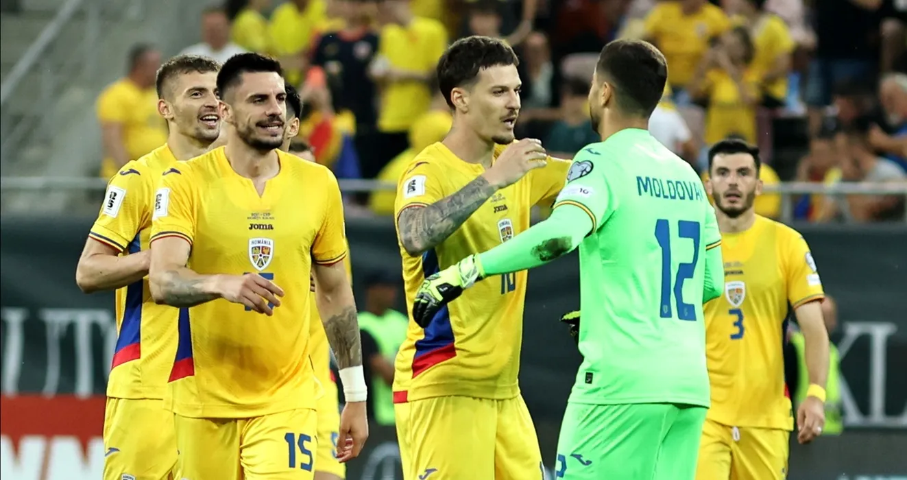 Jucatorii echipei nationale de fotbal a Romaniei reactioneaza dupa ce Dennis Man (C) a inscris un gol in timpul meciului contra selectionatei Ciprului din preliminariile Cupei Mondiale din 2026, disputat pe Arena Nationala din Romania, marti, 10 iunie 2025. GEORGE FLUSTER / MEDIAFAX FOTO