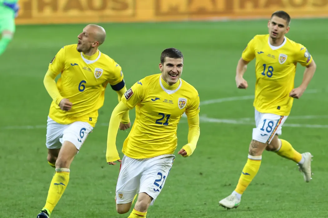 Reprezentativele Romaniei (echipament galben) si Macedoniei de Nord s-au intalnit intr-o partida contand pentru preliminariile CM 2022, joi 25 noiembrie 2021, pe Arena Nationala din Bucuresti. GEORGE FLUSTER / MEDIAFAX FOTO
