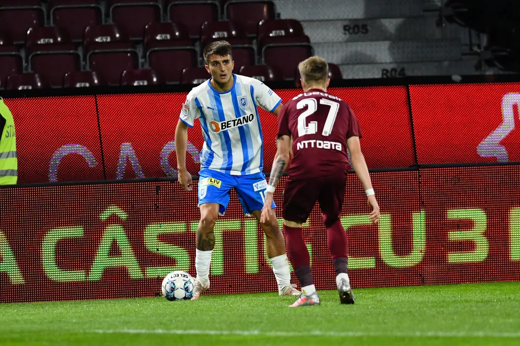 Stefan Vladoiu (S), de la CS Universitatea Craiova, suteaza in timpul meciului de fotbal contra echipei CFR Cluj din etapa a IX - a a Ligii 1, disputat pe stadionul Dr. Constantin Radulescu, luni, 20 septembrie 2021. FLAVIU BUBOI / MEDIAFAX FOTO