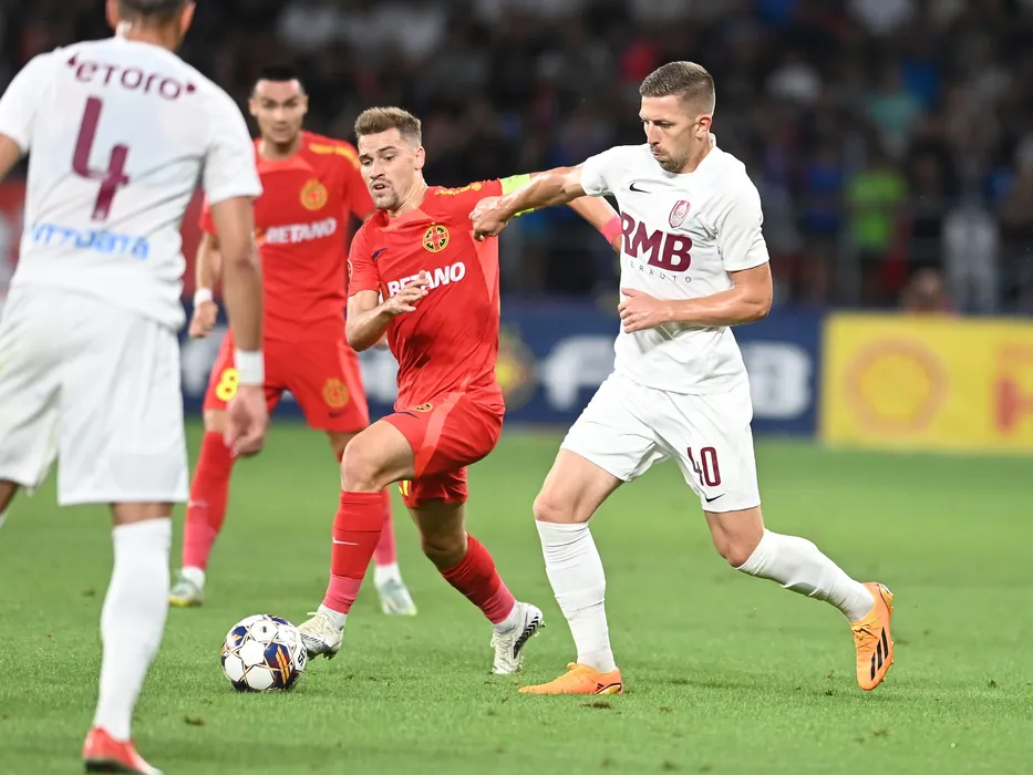 Darius Dumitru Olaru si Lovro Cvek in meciul de fotbal dintre FCSB si CFR Cluj, din cadrul Superligii Superbet, desfasurat pe Stadionul Steaua-Ghencea din Bucuresti, duminica 6 august 2023. © FOTO:Razvan Pasarica/SPORT PICTURES
