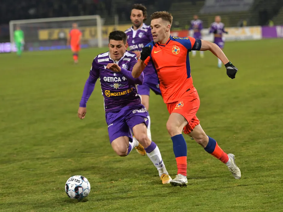 Costinel Andrei Tofan si Darius Dumitru Olaru in meciul de fotbal dintre FC Arges si FCSB, contand pentru Play-off-ul Ligii 1 Casa Pariurilor, desfasurat pe Stadionul Nicolae Dobrin din Pitesti, duminica 20 martie 2022. © FOTO:Razvan Pasarica/SPORT PICTURES