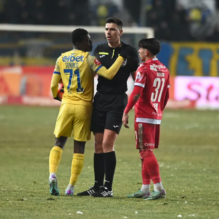 Arbitrul central Marian Barbu și Seniko Romeo Doua, Costin Ionuț Amzar în meciul de fotbal dintre ACS Petrolul 52 Ploiești și SC Dinamo 1948 București contând pentru SUPERLIGA SUPERBET, desfășurat pe Stadionul Ilie Oană din Ploiești, sâmbătă 20 ianuarie 2024. © FOTO: Răzvan PĂSĂRICĂ/SPORT PICTURES