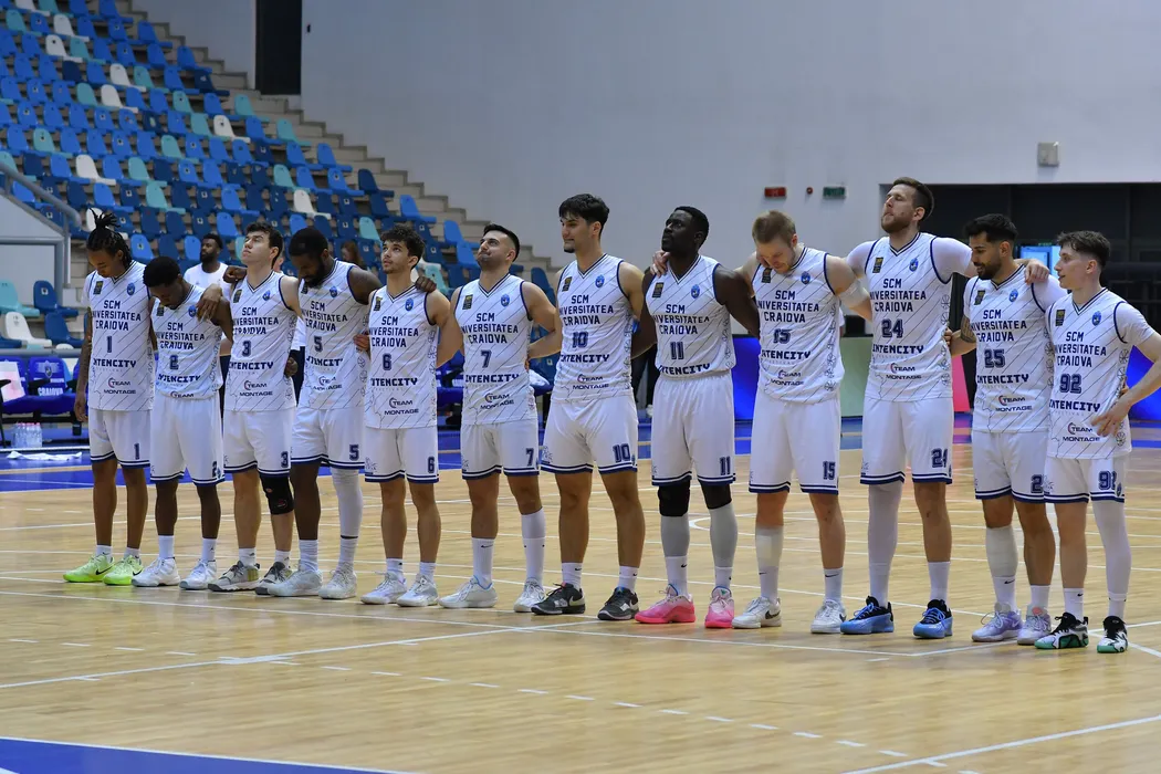 Baschetbalistii craioveni la startul meciului de baschet masculin dintre SCMU Craiova si CSM CSU Oradea, contând pentru Liga Nationala de baschet masculin Getica 95, desfasurat în Sala Polivalenta din Craiova, miercuri 7 mai 2025. © FOTO: Remus Badea/SPORT PICTURES