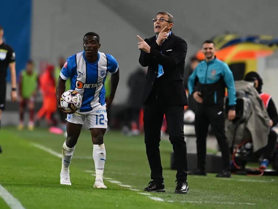 Eugen Neagoe reactioneaza alaturi de Basilio Ndong Owono Nchama in meciul de fotbal dintre Universitatea Craiova si CFR Cluj, contand pentru Play-off-ul Superligii Superbet, desfasurat pe Stadionul Ion Oblemenco din Craiova, duminica 2 aprilie 2023. © FOTO:Razvan Pasarica/SPORT PICTURES