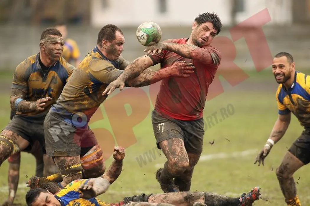 „Bătaie” cu nămol!** Derby-ul Superligii de rugby s-a jucat într-o „mlaștină”