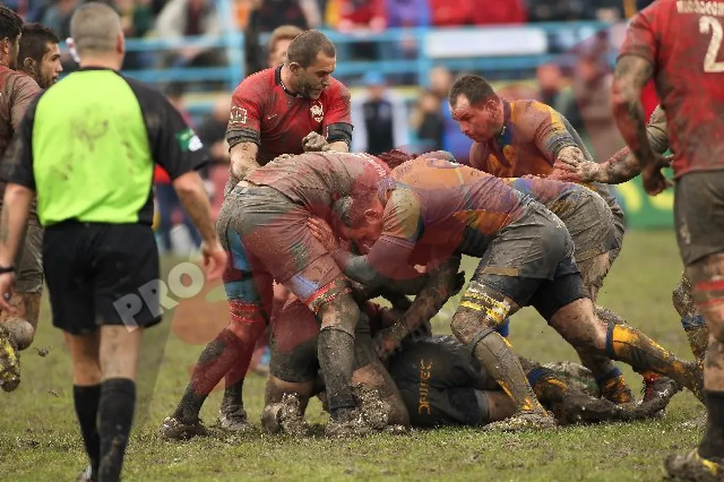 „Bătaie” cu nămol!** Derby-ul Superligii de rugby s-a jucat într-o „mlaștină”
