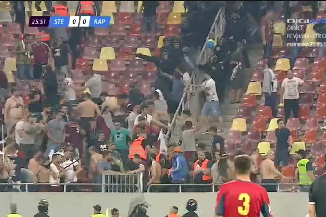 Bătaie generală pe Arena Națională! GALERIE FOTO | Imagini cu haosul creat de steliști și rapidiști. HORROR: răniții au fost cărați pe brațe