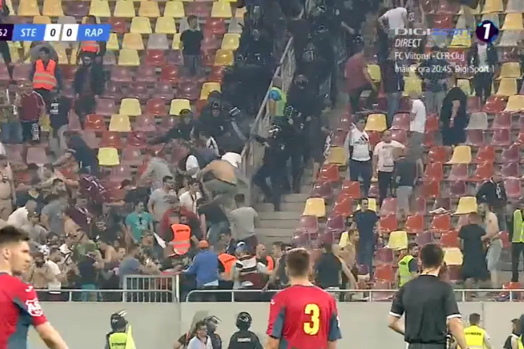 Bătaie generală pe Arena Națională! GALERIE FOTO | Imagini cu haosul creat de steliști și rapidiști. HORROR: răniții au fost cărați pe brațe