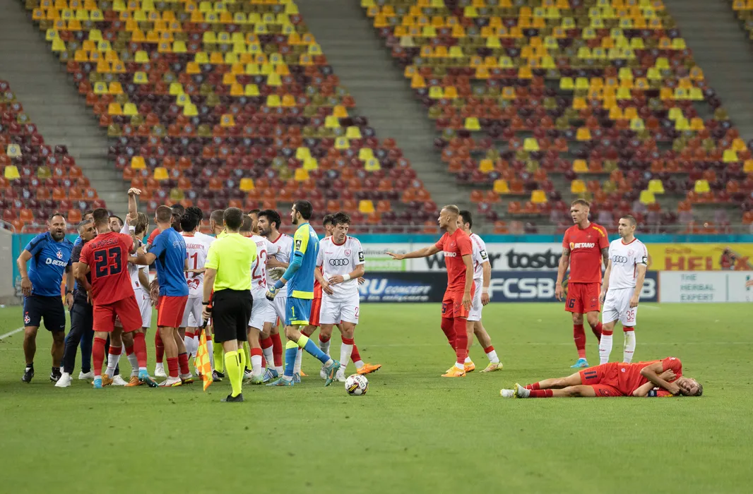 Bătaie generală pe Arena Națională, în ultimele minute ale jocului dintre FCSB și Saburtalo! Arbitrul belgian a acordat 3 cartonașe la finalul altercației dintre fotbaliști
