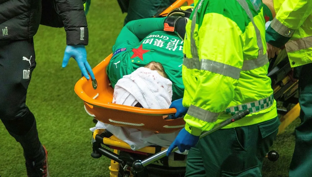 Ondrej Kolár of Slavia Praha gets treatment for his facial injury during the Europa League last 16 match at Ibrox Stadium, Glasgow.