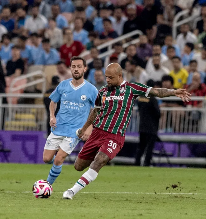 JEDDAH, SAUDI ARABIA - DECEMBER 22: Felipe Melo (R) of Fluminense in action during of the FIFA Club World Cup Final match between Manchester City and Fluminense at King Abdullah Sports City in Jeddah, Saudi Arabia on December 22, 2023. Mohammed Saad / Anadolu,Image: 831830952, License: Rights-managed, Restrictions: , Model Release: no