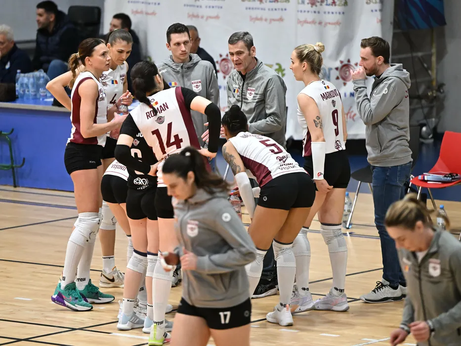 Voleibalistele rapidiste printre care Ioana Baciu, Nasya Dimitrova si Nika Markovic la un timeout alaturi de antrenorul lor Darko Zakoc in meciul de volei feminin dintre CSM Bucuresti si Rapid Bucuresti, contand pentru Divizia A1, desfasurat in Sala Polivalenta Elite Sport din Bucuresti, miercuri 27 martie 2024. © FOTO:Razvan Pasarica/SPORT PICTURES