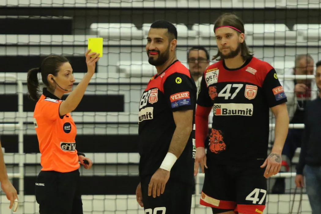 Arbitrul Cristina Nastase (S) arata cartonasul galben unui jucator de la formatia CS Dinamo (echipament negru-rosu), in timpul partidei acesteia cu Steaua, in etapa cu numarul 21 a Ligii Nationale la handbal masculin, joi 5 martie 2020, in sala Dinamo din Bucuresti. GEORGE FLUSTER / MEDIAFAX FOTO