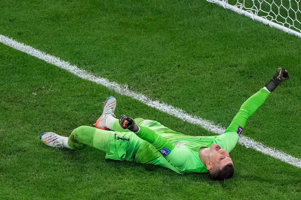 Croatia goalkeeper Dominik Livakovic celebrates as Croatia win the penalty shootout