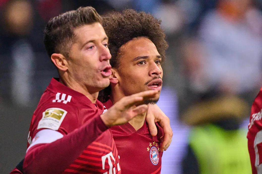 Leroy SANE, FCB 10 celebrates his 0-1 goal, happy, laugh, celebration, with Robert LEWANDOWSKI, FCB 9 in the match EINTRACHT FRANKFURT - FC BAYERN MÜNCHEN 0-1 1.German Football League on Feb 26, 2022 in Frankfurt, Germany. Season 2021/2022, matchday 24, 1.Bundesliga, FCB, München, 24.Spieltag
