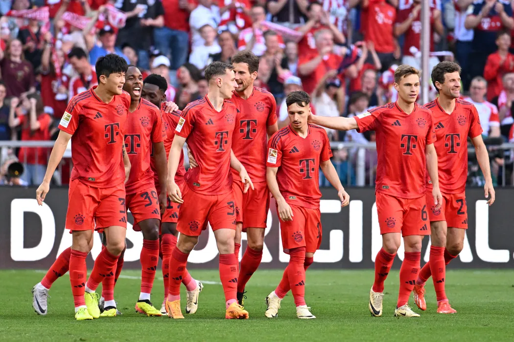 12 May 2024, Bavaria, Munich: Munich's Lovro Zvonarek (4th L) celebrates scoring his side's first goal with teammates during the German Bundesliga soccer match between Bayern Munich and VfL Wolfsburg at Allianz Arena. Photo: Lukas Barth/dpa - IMPORTANT NOTICE: DFL and DFB regulations prohibit any use of photographs as image sequences and/or quasi-video.