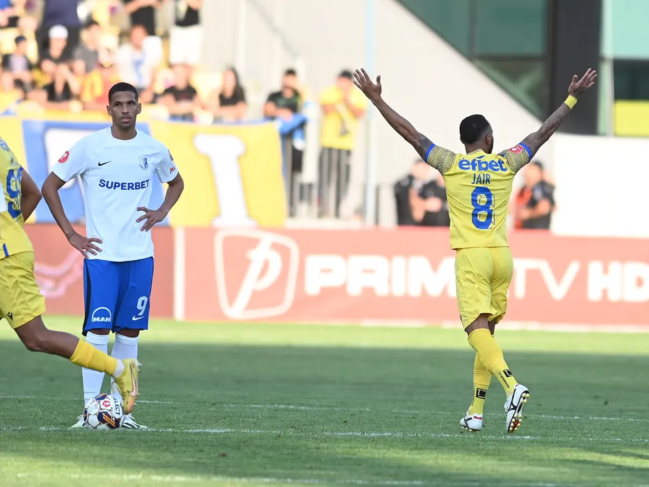 Jair Tavares Silva se bucura dupa un gol marcat spre dezamagirea lui Rivaldinho (Mosca Rivaldo Vitor Ferreira) in meciul de fotbal dintre Petrolul Ploiesti si Farul Constanta, din cadrul Superligii Superbet, desfasurat pe Stadionul Ilie Oana din Ploiesti, duminica 6 august 2023. © FOTO:Razvan Pasarica/SPORT PICTURES