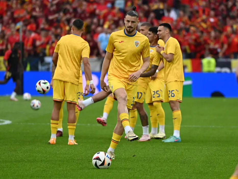 Fotbalistii romani printre care Radu Drăgușin la incalzire inaintea meciului dintre Belgia si Romania, contand pentru UEFA EURO 2024, desfasurat pe Stadionul Cologne din Koln, sambata 22 iunie 2024. © FOTO:Razvan Pasarica/SPORT PICTURES