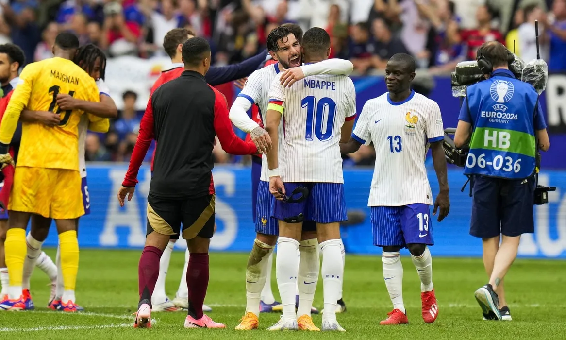 France's Theo Hernandez and Kylian Mbappe celebrate at the end of a round of sixteen match between France and Belgium at the Euro 2024 soccer tournament in Dusseldorf, Germany, Monday, July 1, 2024. France won 1-0.,Image: 886352145, License: Rights-managed, Restrictions: This content is intended for editorial use only. For other uses, additional clearances may be required., Model Release: no